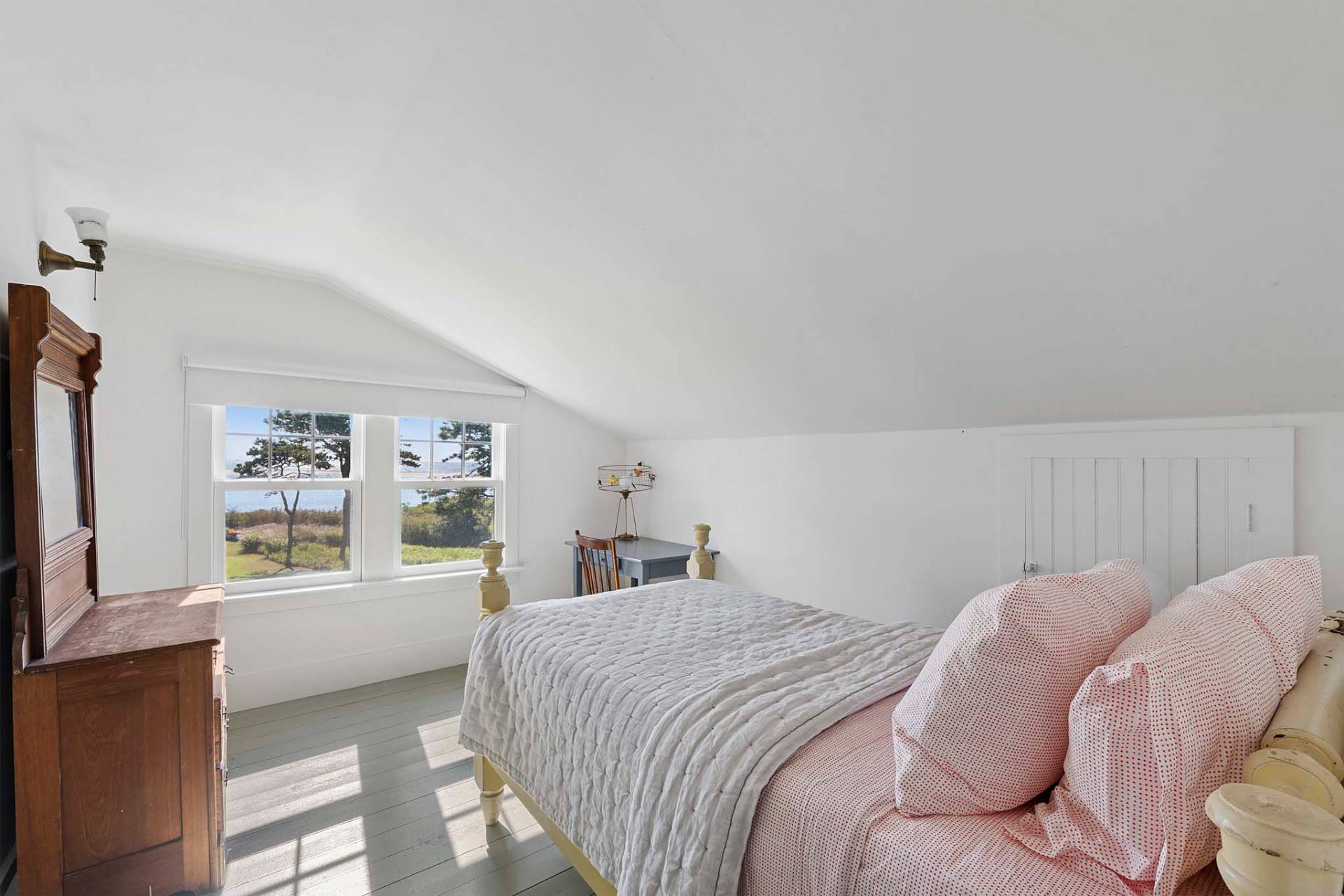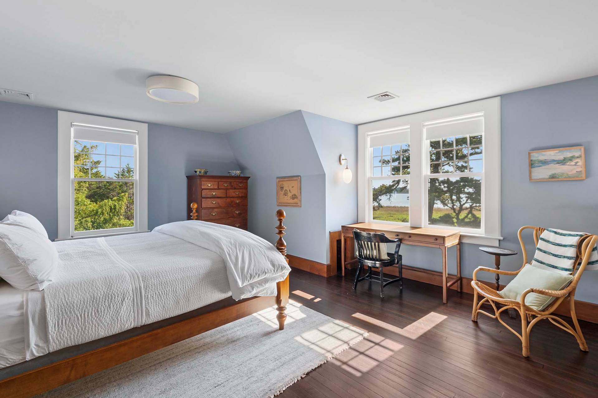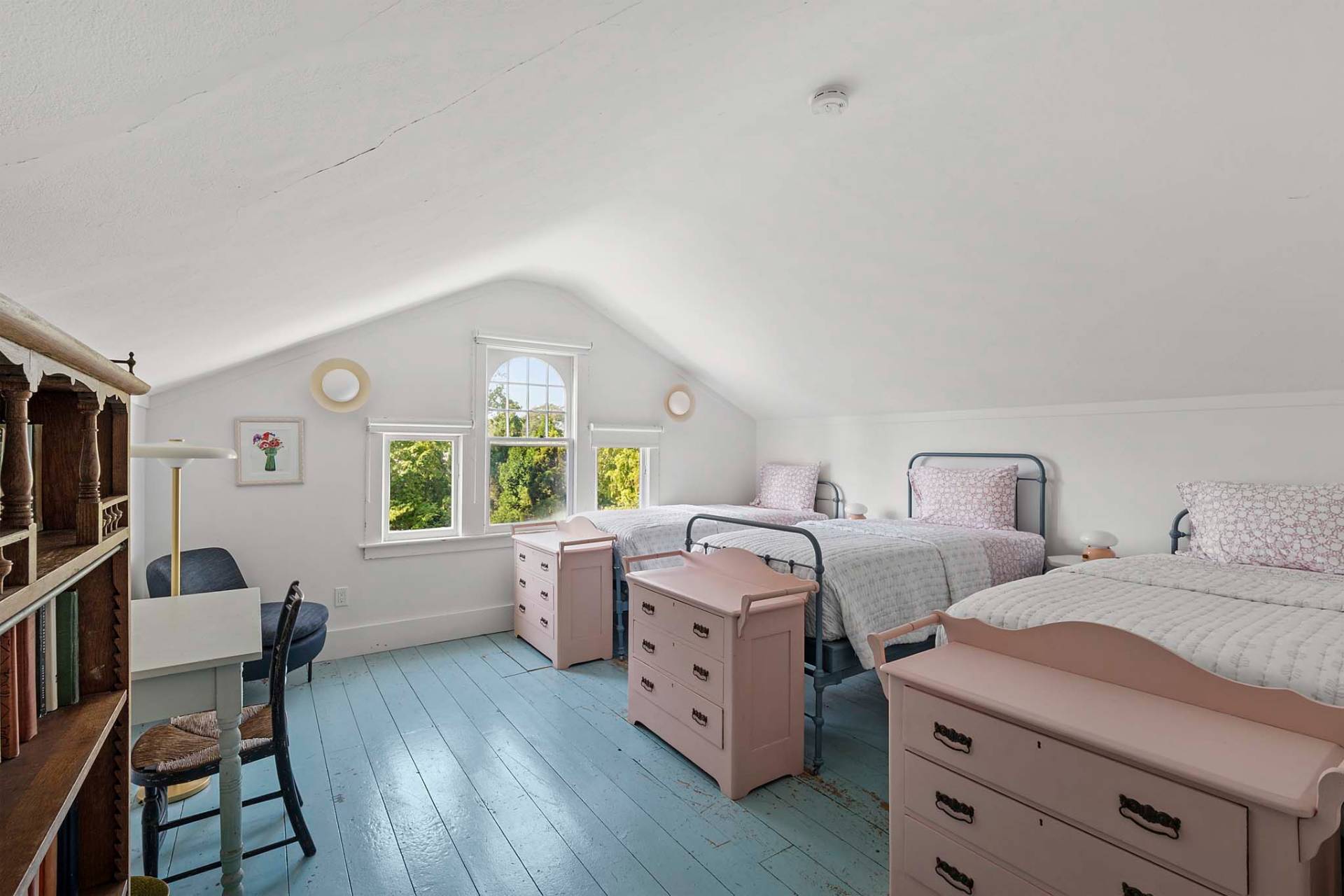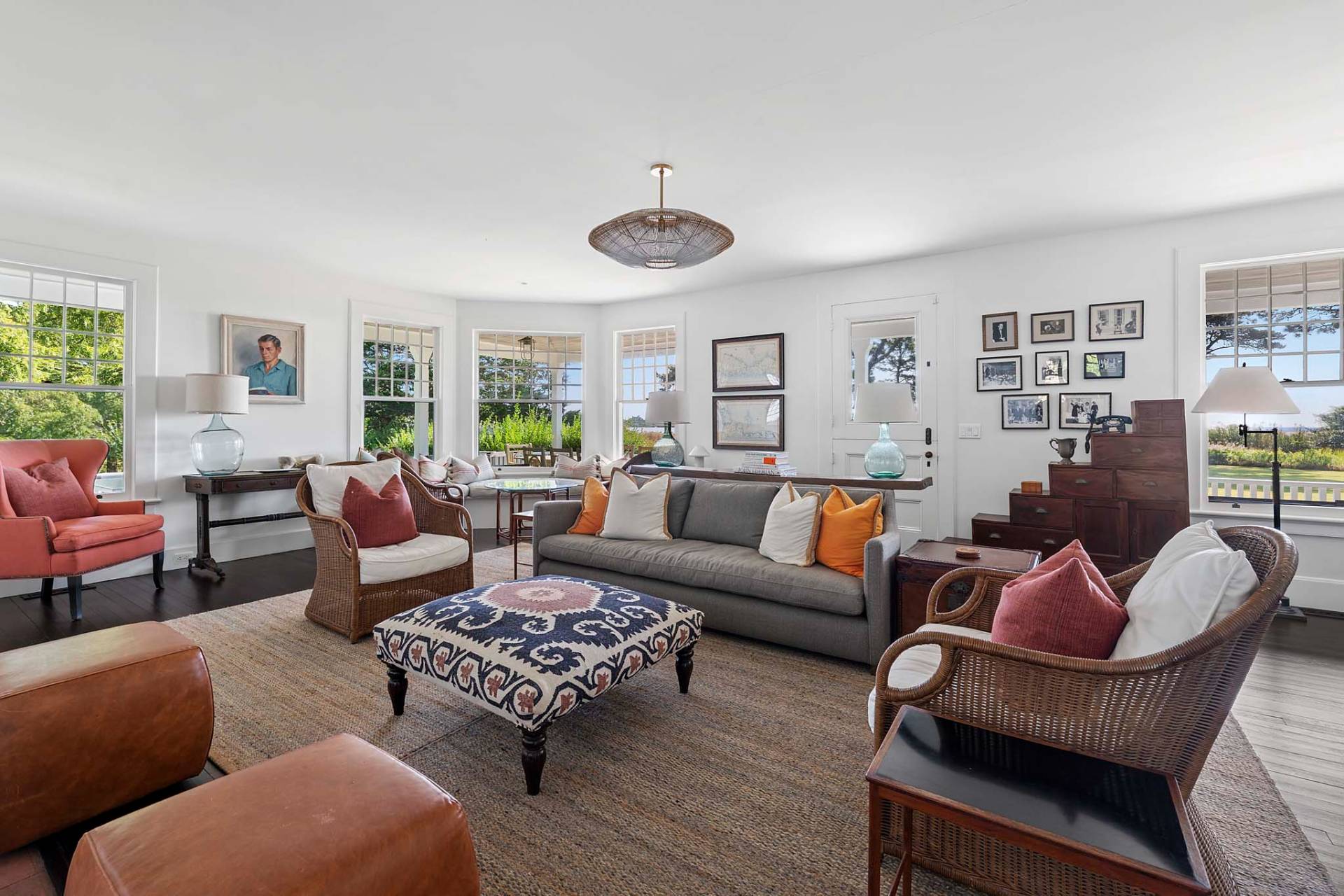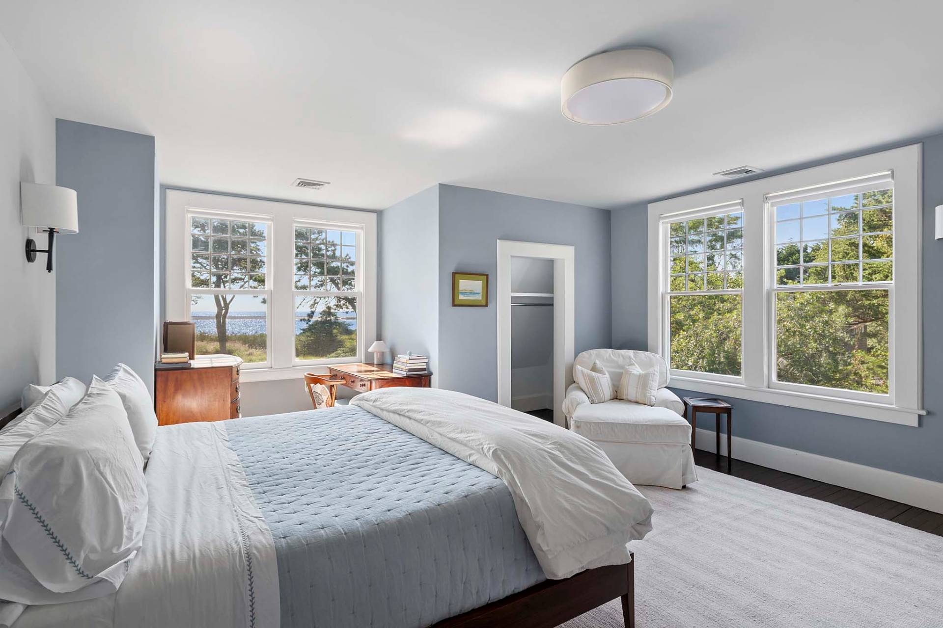 Situated on 3.2 acres amid broad lawns, the 4,500+/- sq. ft. home offers eight bedrooms and four and a half baths. Bright interiors with white walls and ceilings and wood floors include a living room with window banquettes, well-equipped eat-in kitchen with central island, high end stainless steel appliances, a breakfast area and adjacent dining room, as well as a media room. Bedrooms and baths are all beautifully finished and appointed and include the primary with luxe marble bathroom. An office/sitting room is tucked upstairs. Amenities include a laundry with two washers and dryers, a walled garden, a topiary maze, and a detached garage with a Tesla/EV charger.