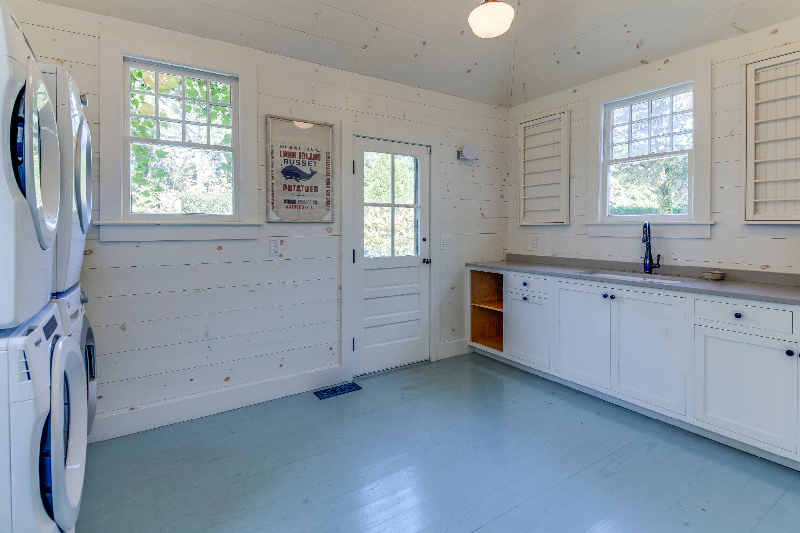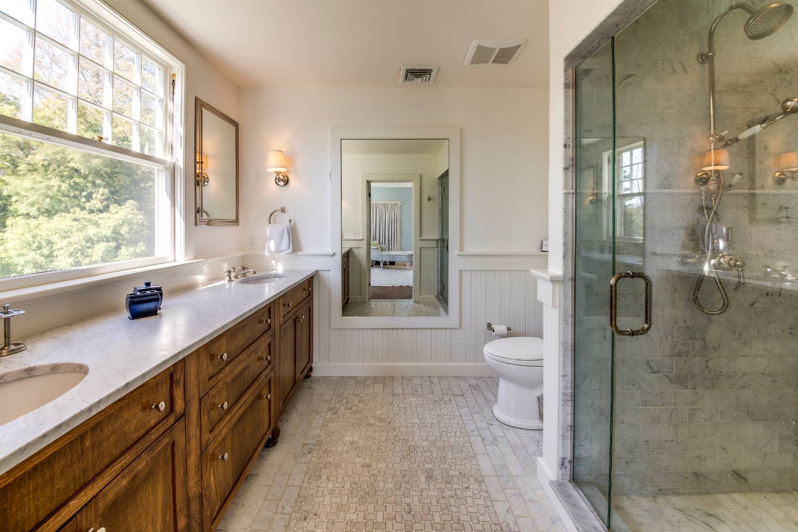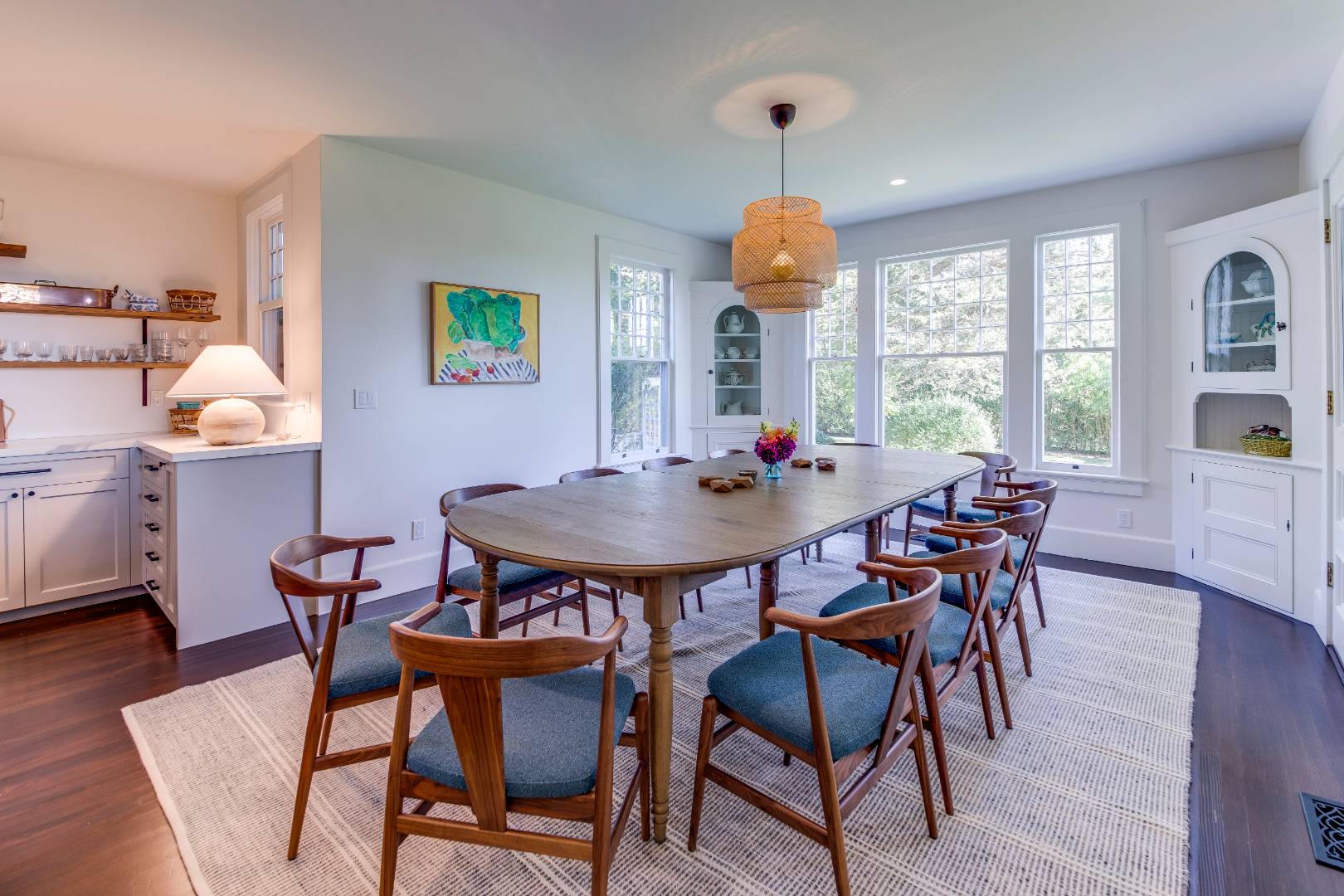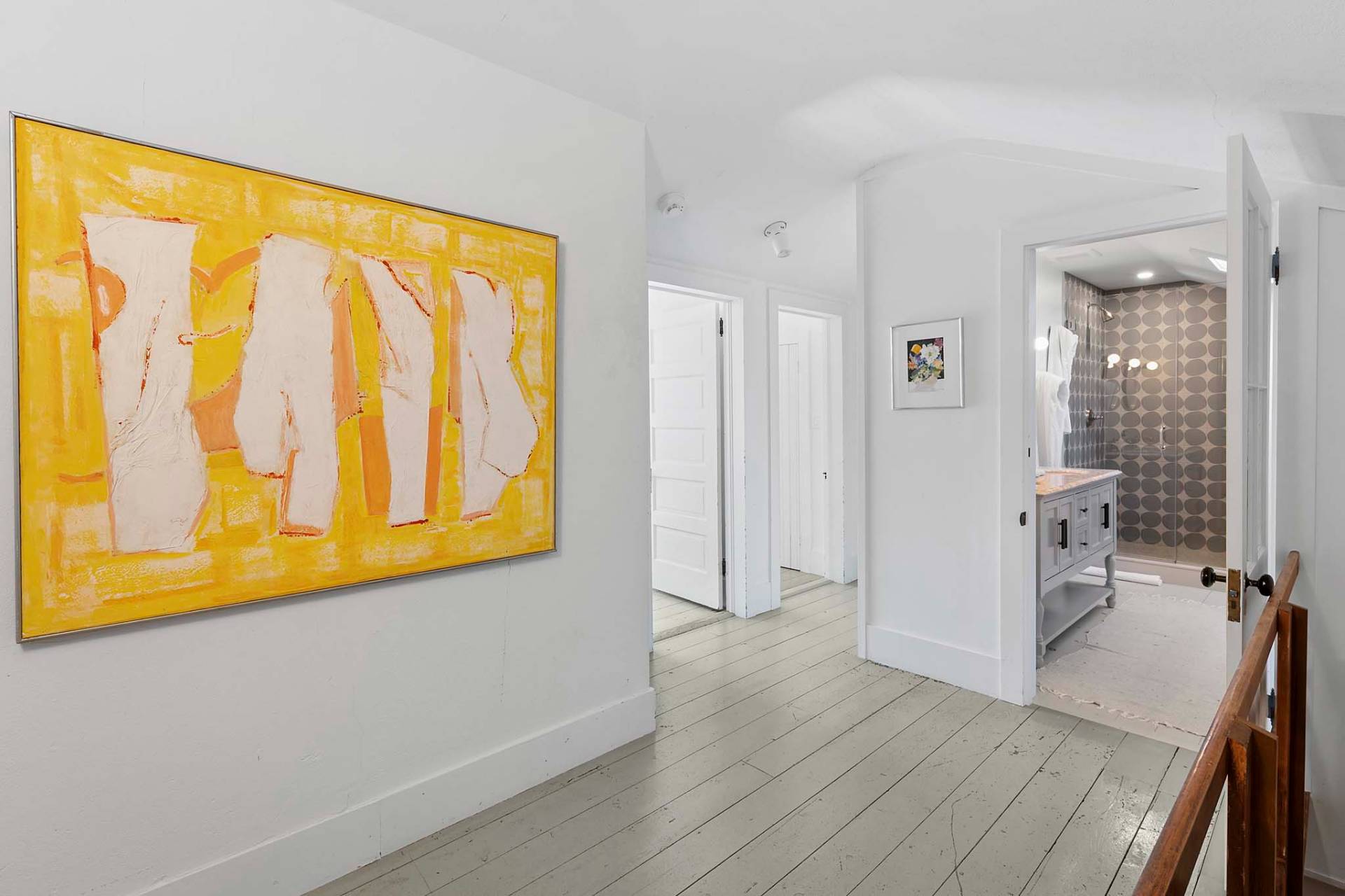 Situated on 3.2 acres amid broad lawns, the 4,500+/- sq. ft. home offers eight bedrooms and four and a half baths. Bright interiors with white walls and ceilings and wood floors include a living room with window banquettes, well-equipped eat-in kitchen with central island, high end stainless steel appliances, a breakfast area and adjacent dining room, as well as a media room. Bedrooms and baths are all beautifully finished and appointed and include the primary with luxe marble bathroom. An office/sitting room is tucked upstairs. Amenities include a laundry with two washers and dryers, a walled garden, a topiary maze, and a detached garage with a Tesla/EV charger.