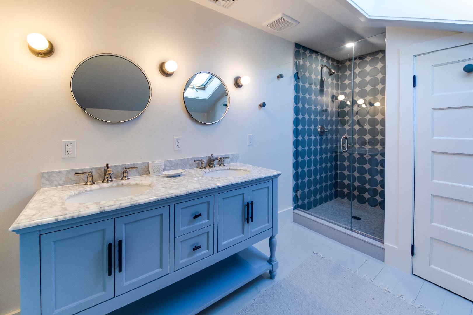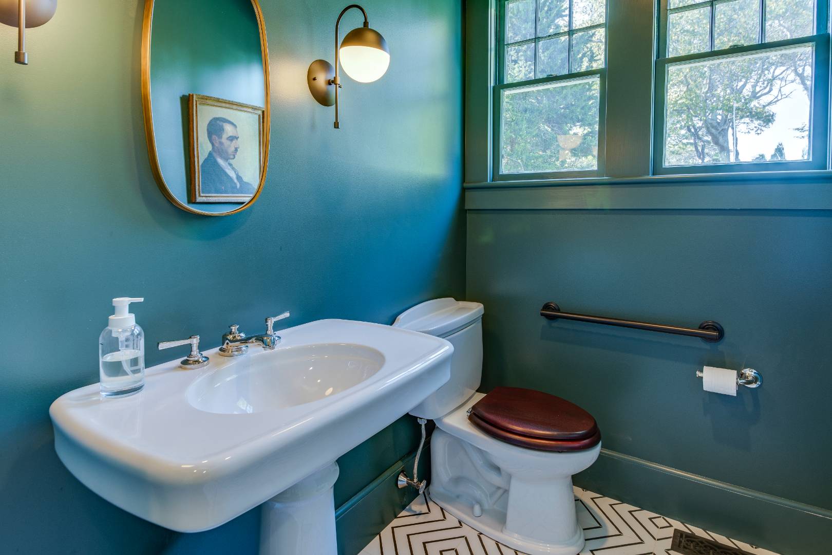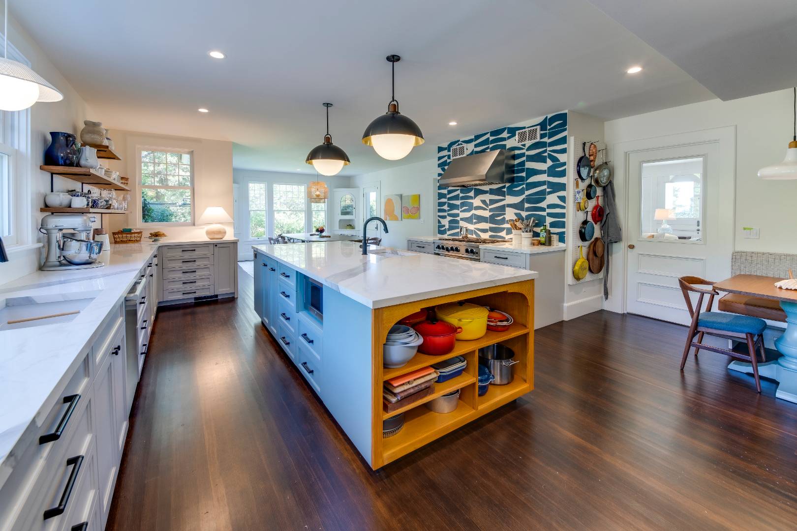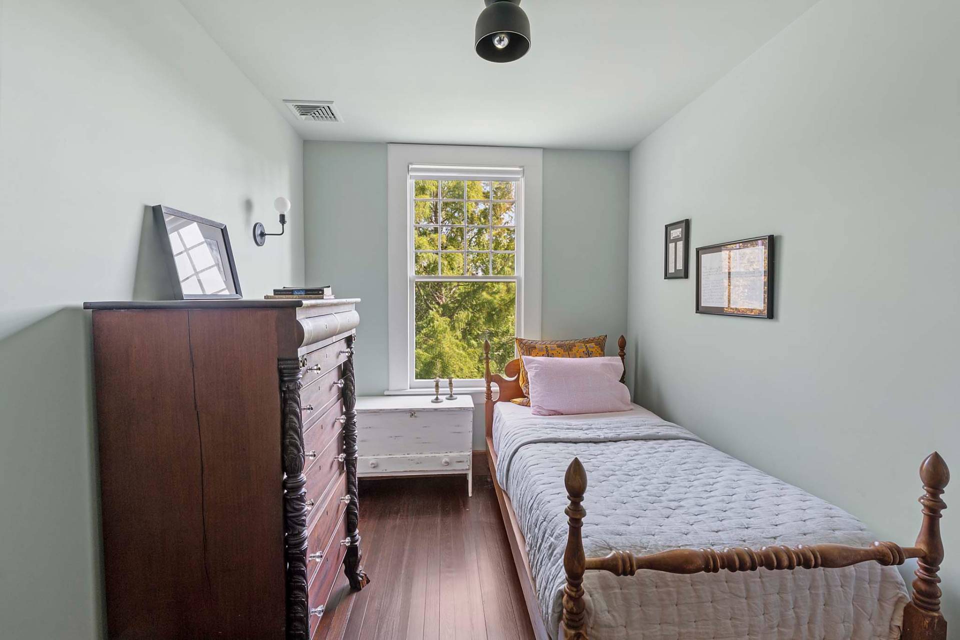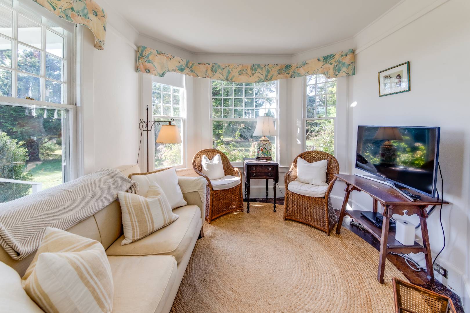 Situated on 3.2 acres amid broad lawns, the 4,500+/- sq. ft. home offers eight bedrooms and four and a half baths. Bright interiors with white walls and ceilings and wood floors include a living room with window banquettes, well-equipped eat-in kitchen with central island, high end stainless steel appliances, a breakfast area and adjacent dining room, as well as a media room. Bedrooms and baths are all beautifully finished and appointed and include the primary with luxe marble bathroom. An office/sitting room is tucked upstairs. Amenities include a laundry with two washers and dryers, a walled garden, a topiary maze, and a detached garage with a Tesla/EV charger.