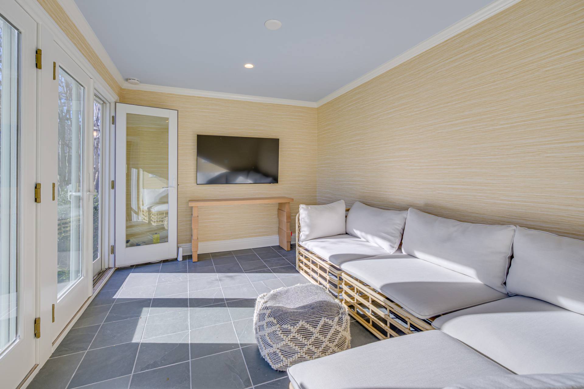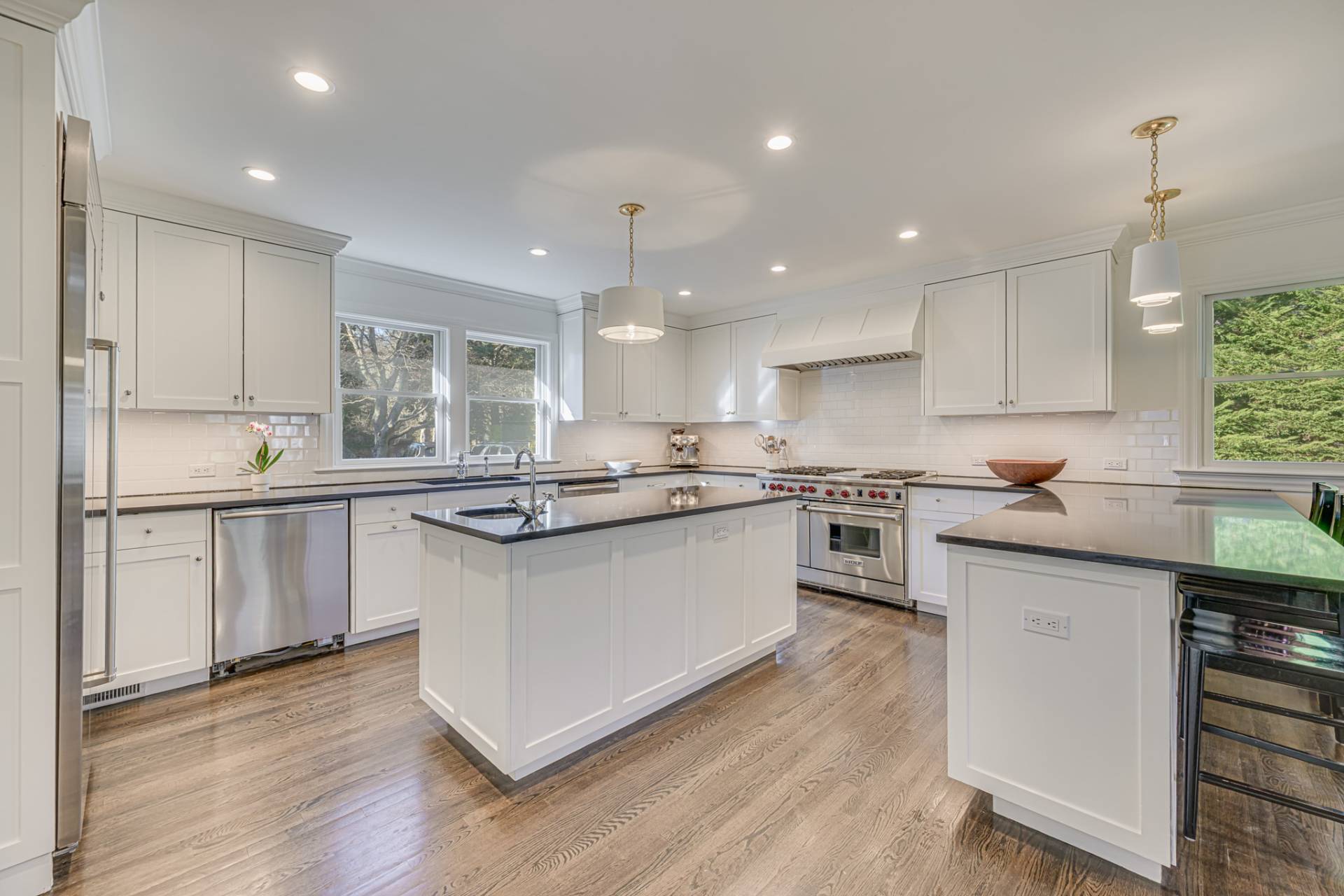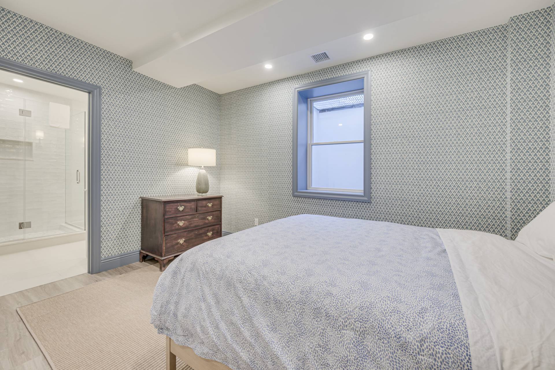 Past a white column entry, the interiors are bright and inviting with elegant designer furniture and easy access to the outdoors. The luxe primary bedroom has a private egress and ensuite bath with shower, soaking tub, and dual vanity. All bedrooms are generously sized and ensuite, perfect for loved ones and guests. The main living areas include a living room with fireplace, new eat-in kitchen, sunroom, and dining room for relaxing mornings and entertaining in the evening. The finished lower level is ready for games and movie night and includes a private ensuite bedroom.