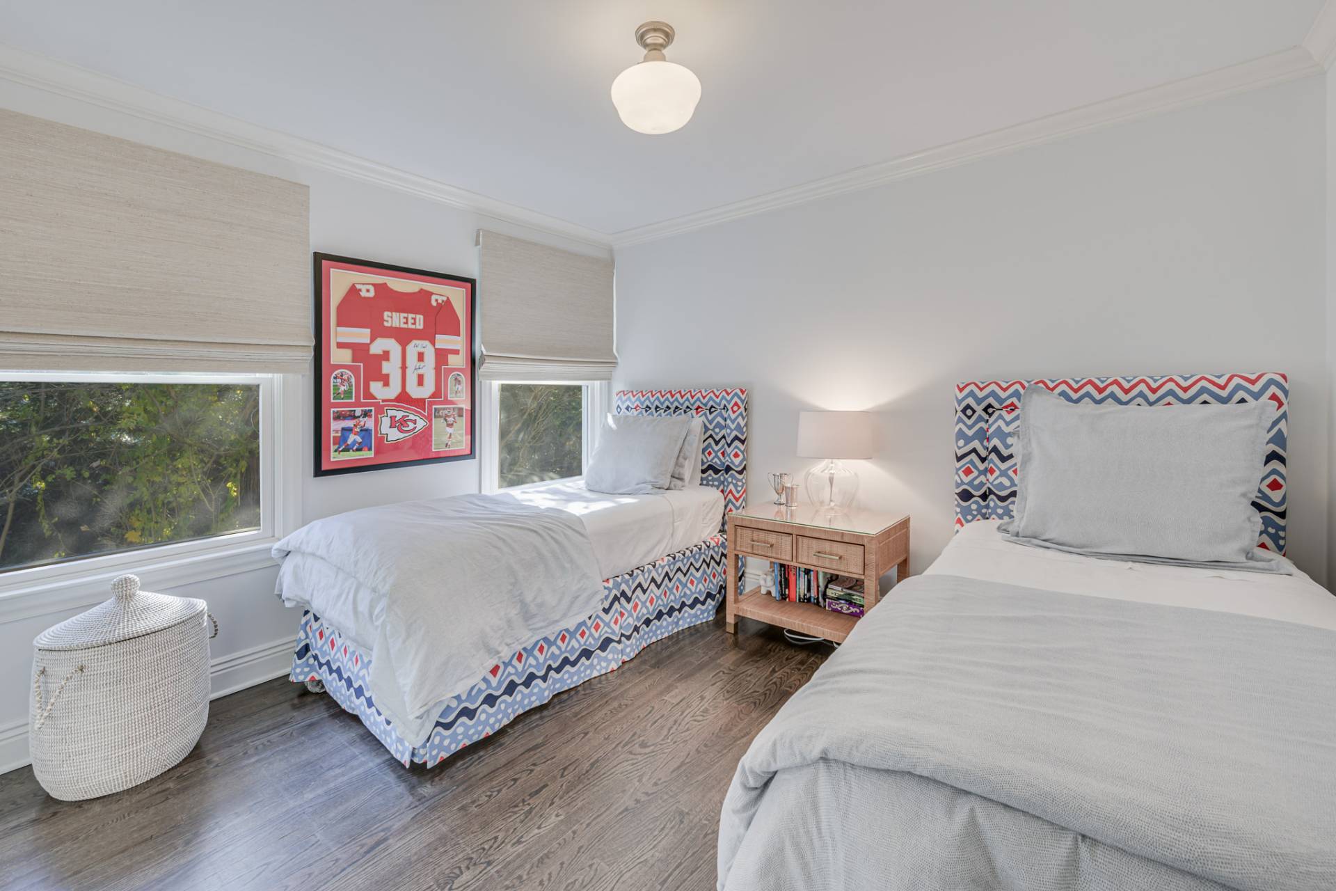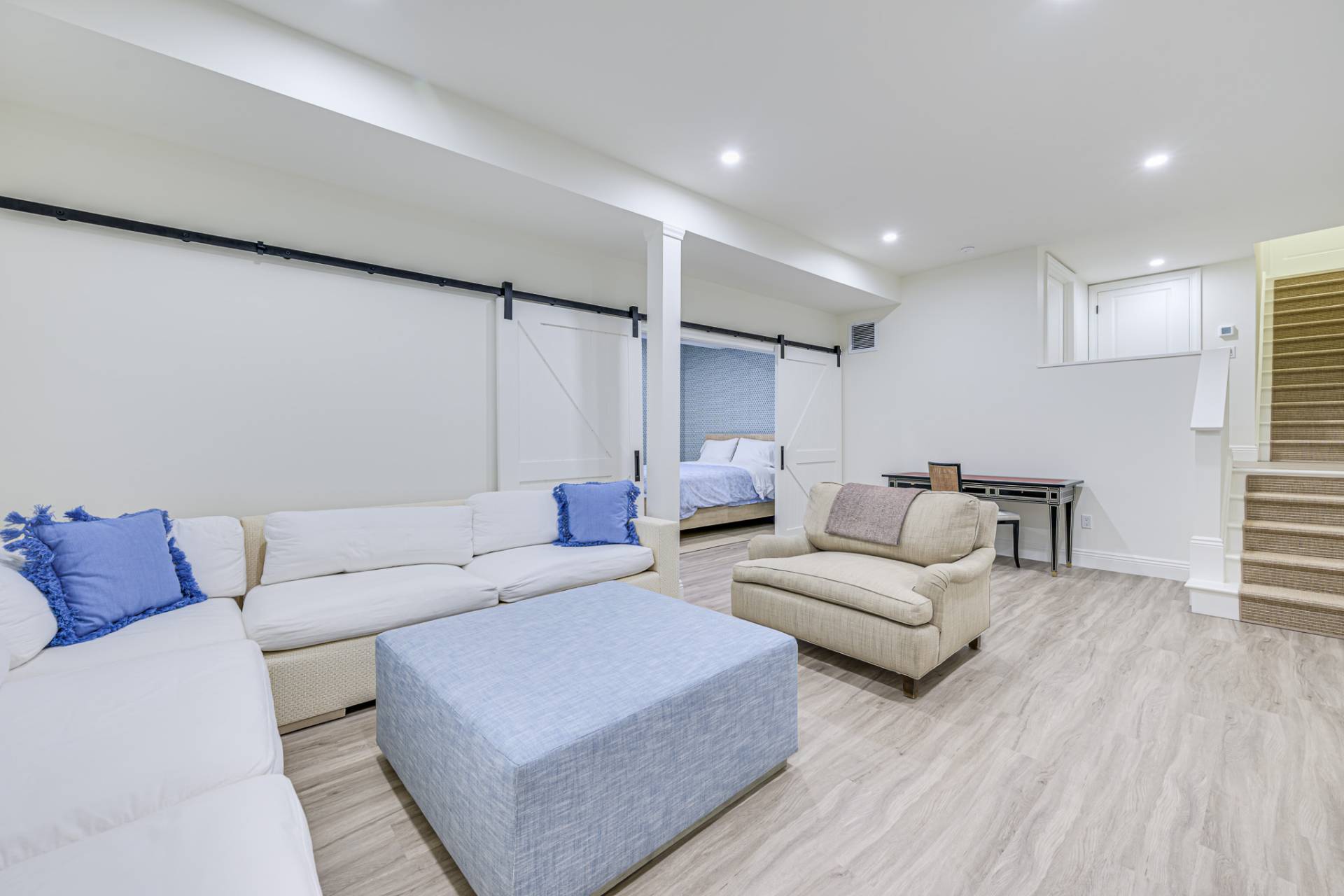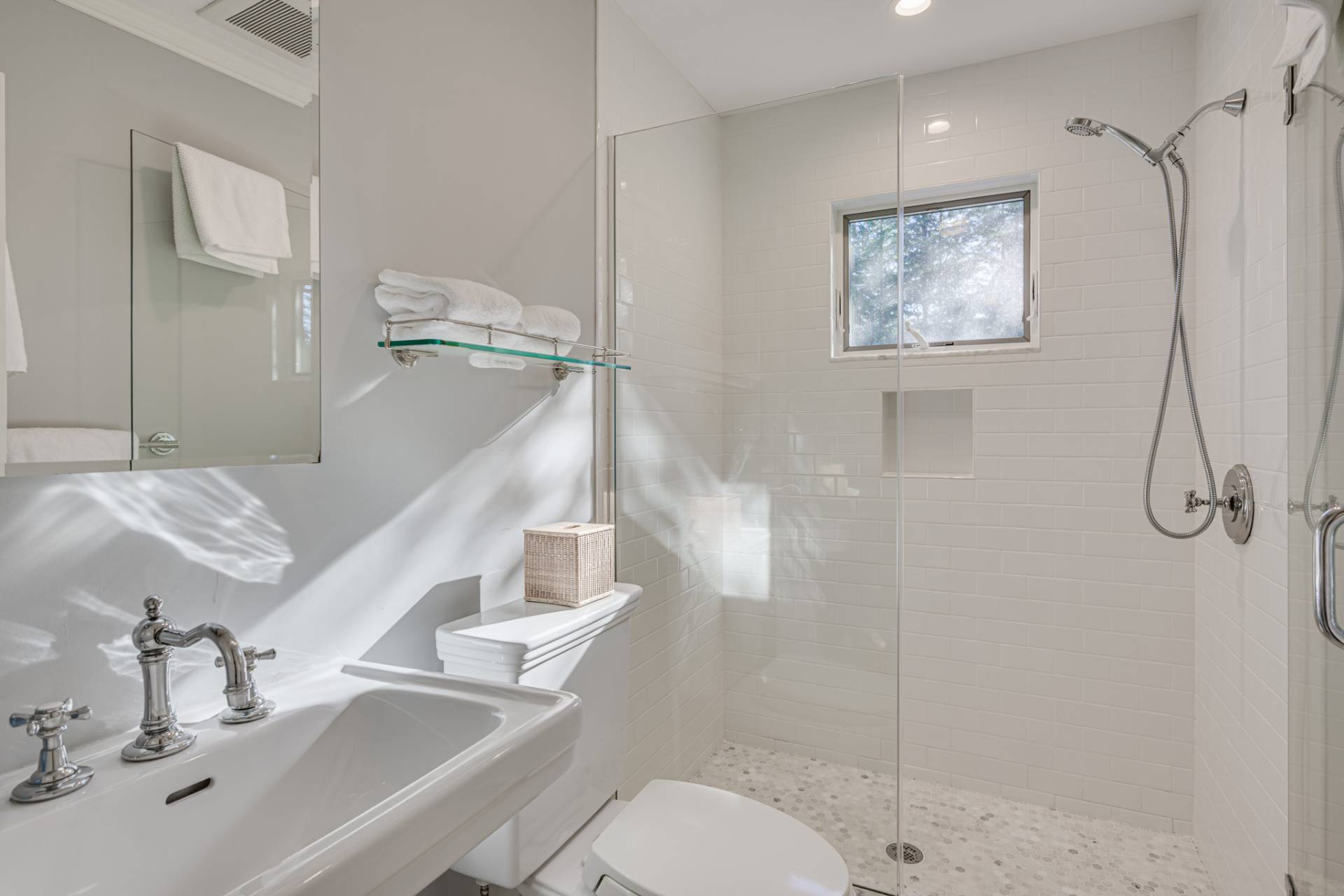 Past a white column entry, the interiors are bright and inviting with elegant designer furniture and easy access to the outdoors. The luxe primary bedroom has a private egress and ensuite bath with shower, soaking tub, and dual vanity. All bedrooms are generously sized and ensuite, perfect for loved ones and guests. The main living areas include a living room with fireplace, new eat-in kitchen, sunroom, and dining room for relaxing mornings and entertaining in the evening. The finished lower level is ready for games and movie night and includes a private ensuite bedroom.